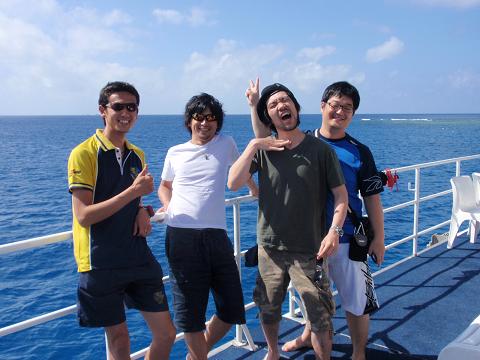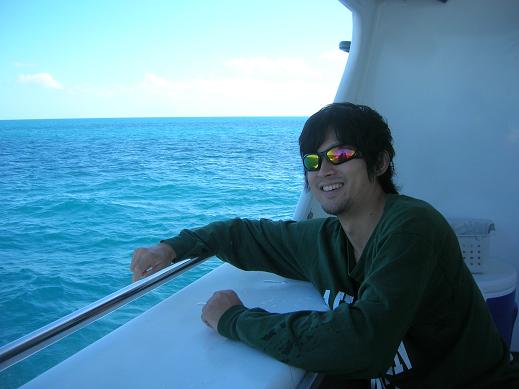しばらく休んだら2ndダイブ。今回のインストラクターはSoji。さっきと同じスポットを今度は実技無しで楽しむ。慣れたせいか1回目よりも楽にこなせるね。また30分くらい潜って船に上がる。水面でBDCの脱着・再着用の実技をするんだけど、流れがあるのと肩が痛いのでジタバタとモガク。フム、なかなか装着できんぞ。そうこうするうちに少し船から流されてしまった・・・。Sojiが早く船に上がりますよと催促に来た。Y太郎が、「議長まだ装着してないっす」と説明するがSojiはワシらを上がるように急かす(数日後でなんでかわかる!)。しょうがないね、落ち着いてBDCを装着して船まで泳ぎ、ようやく乗船。流石に疲れたけど、飯が待ってるぜ!おっと、また鼻血ブーだよ。