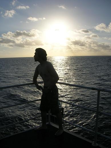 夕日がきれいだねぇ。夕飯を食った後はRiuさんはナイトダイブ。夜はサメがでるらしい。船のライトに寄ってくるんだよね。船の後ろに出てみると確かにサメがうろちょろしてるよ。まぁ、1メートルくらいのサメだから襲っては来ないけどね。スイス姉ちゃんとマンチェスター出身のBrianと仲良くなる。それにしてもBrianお前は1回も潜ってないだろ。何しに来たんだ?「リラックス」。なるほど・・・。