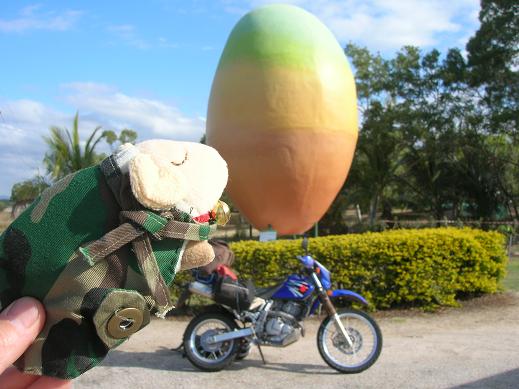 7時ごろYHAを後にし、ガソリンはまだ入ってるから一気にInisfail(88km)まで走る。往路と同じ道だから勝手がわかてて楽だよね。往路で逃したBowenのビッグマンゴーで写真を撮って4時半にはAirlie Beach YHAに到着。途中に “WWII Site turn left”とか標識が出てたけど走ってると道曲げるの億劫なんだよね。そのまま通り過ぎてしまった。