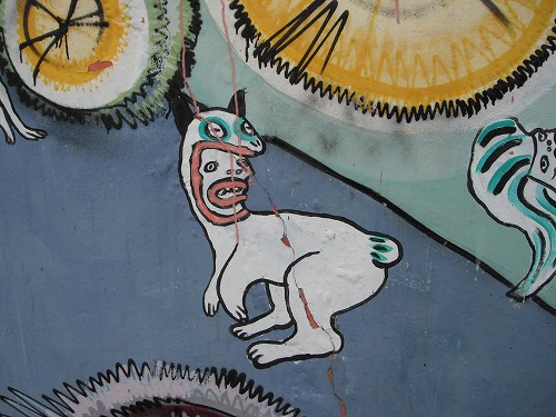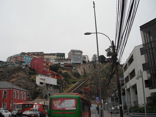 バルパライソは海岸からいきなり山が連なるという地形に発展した街。急斜面に家が牡蠣のようにへばりつく感じです。色とりどりの家、落書きのレベルを超えた落書き、市民の足として利用される「アセンソール(坂を上下するケーブルカーみたいなの)」などなどが見所。街並み全体が世界遺産として登録されている、らしい。海と青空とのコントラスト映えて美しいはずだ、が、しかし、今日は曇り空。