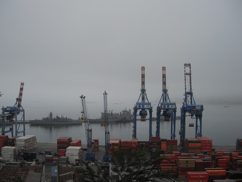 バルパライソはサンティアゴの海の玄関としても栄えていて、巨大コンテナが港に積み上げられています。そして軍港としても機能していますので、駆逐艦も何隻かみられました。