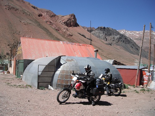 I was thinkng like that and kept riding, so I almost missed the monument of "Puente del Inca". I saw 2 motorcyclists waving to me, so I realised it was there. They were a German couple travelling with their 20-year-old SUZUKI DR350. I told them they were just like Mark&Claire, and they said they met Mark&Claire in Valparaiso 3 days ago!! What a small world. But I wondered why Mark&Claire were there 3 days ago. They should have been down south. Then 2 Germans told me that Mark&Claire were to go home as Claire'S dad is in a hospital.