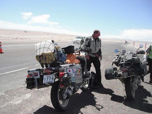 今日は朝9時ごろに出発しようと思っていたのですが、6時ごろに目が覚めてしまいました。ちょっとベッドの上でウダウダして、外に出るとライダーがいました。そうです、もう1つのオレンジ色のGSのオーナーです。彼はフレッド、ドイツ人。チリでGSを買って3ヶ月間でチリ、ペルー、ボリビア、アルゼンチンを旅するのだそう。「今日は何処まで?」と訊くと、「チリのカラマまで。」と言うので、同じ目的地。なので一緒に行くことに。だから出発は早めになりました。