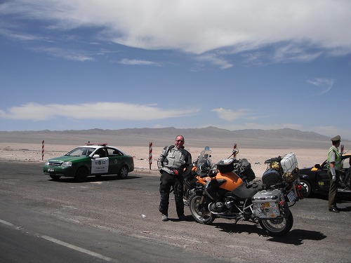 So we took off. The land scape of Atacama desert was awesome. But soon after we left Calama, we were stopped at a police check point. But we just showed our documents and they let us go. We took some potos there.