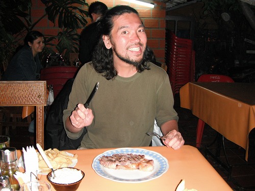 夕飯はステーキ屋「Cumanu Churrasqueria」で。250グラムのステーキとチップス、サラダなどの付け合せで48ボリと少々高いですが、最高のステーキ!! ちゃんとレアに焼かれて、美味い事。アルゼンチンの肉は噂ほど大したことないとよく旅行者に聞くので、ここボリビアで美味い肉を食べておいて正解ですね。捕鯨の話、ヒトラーがもし負けなかったら何を目指していたのか?などについての話、先進国での若者のやる気の無さについての話、東ドイツ時代の話と、いろいろ有意義な話をして盛り上がりました。
