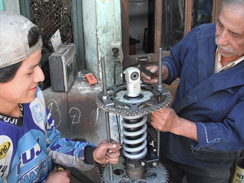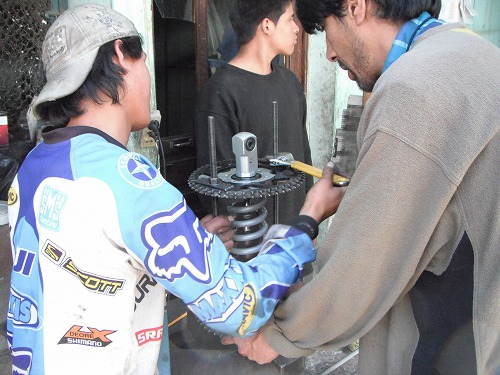 9時になったので「Motoservi」へ。ESAが付いているのでショックからバネを取るのに苦労。特別な「工具」を一から作ります。流石ボリビア。なんだかんだで「工具」が出来たのは11時半ごろ。それからショックからバネを取り出す作業に入ります。