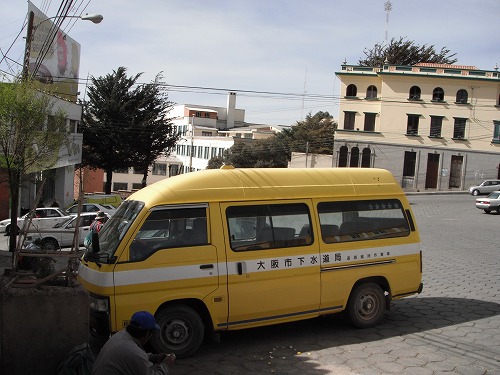 このような日本の中古車がボリビアでは何処でも見られます。「大阪市下水道局 道路維持作業車」とありますね。