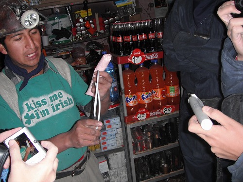 In Potosi, there is no regulation on buying/selling dynamites. So anyone, even kids can buy it! Dangerous!! It costs 15 to 24Bs. We would not have many chance to touch dynamites elsewhere, so we took a few photos with dynamites.