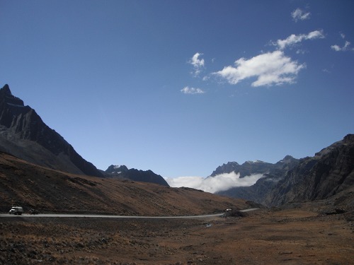 ラパスまで舗装路を走ります。所々崖崩れで舗装が持っていかれたのでしょうか、ダートになっていますが、ワインディングの気持ちいい道ですね。風景もなかなかです。標高が上がるにつれ寒くなっていきます。昨日GPSで見るのを忘れましたが、最高点は4,670メールくらいです。寒いわけだ。