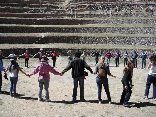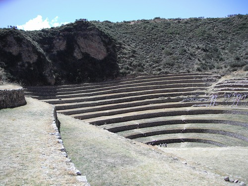 We went down to the centre of the circle. The stone stairs were made so cleverly. In the centre of the circle, those stones were piled and coca leaves and others were placed as offerings. There was a water channel from top to bottom (for irrigation).
