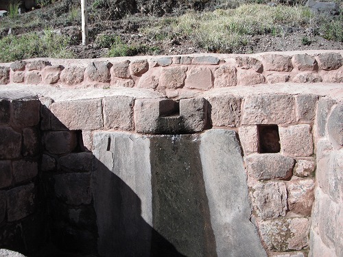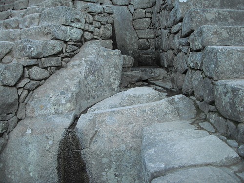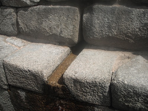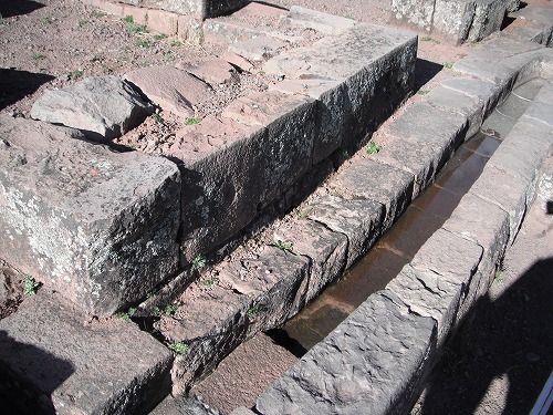 きっちりとインカ・ブロックを使った建物もありますが、ただ単に石を積み上げたものもあります。水路があり水が流れてますが、水源にはホースで水を引いてました。