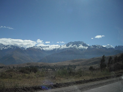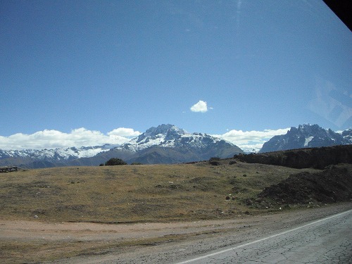 運転手が飛ばす飛ばす。ガンガン他の車を抜いてきます。クスコを出ると直ぐに氷河を頂いた山々が見えます。絶景ですね。フランクがあの道はイイよ、と言ってたのもうなずけます。