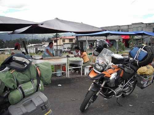 途中検問に引っかかりました。ペルミソと免許証を提示してしばらく待たされた後再出発。ここでマークとクレアが追いつきました。検問に引っかかる前に先に行ってもらいました。昼飯は路肩の露店で1.25ドル。