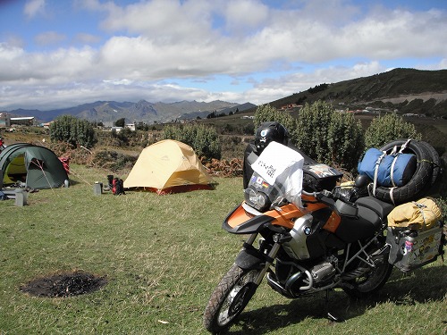 早朝まで雨が降っていましたが7時過ぎにはあがりました。朝飯を食べてテントを畳んで出発の準備。羊の群れがキャンプサイトにやってきました!ヒツジ大興奮!! 今日はキロトア・ループ(Quilotoa Loop)です。しばらくダートが続くので気を付けて行かなければなりません。フロントタイヤはツーランス。殆どオンロード使用なので砂利や砂の上で全くグリップしないからです。