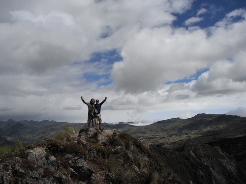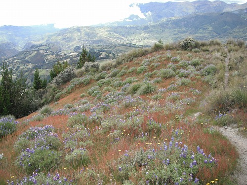 色んな花が咲き乱れ、右手の目下には美しい湖と荒々しい山肌。左手には村々、畑、谷が見えます。「あぁ、アンデスにいるんだなぁ」と実感できる場所です。ここに来てよかった。しかも仲間と一緒ですからね。