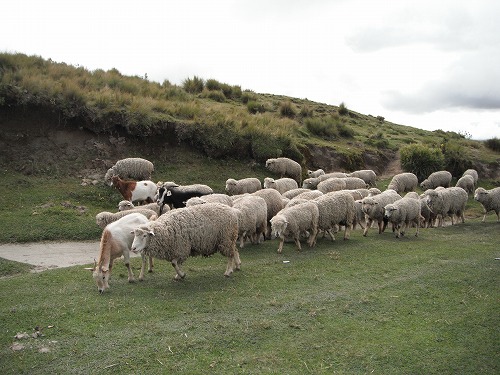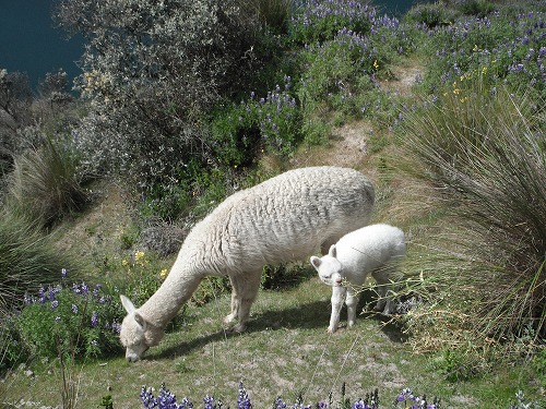 残りあと4分の1くらいのところで白いアルパカの群れが!赤ちゃんもいます。ヒツジも友達に会えて喜んでます。彼らの歩きっぷりはなかなかのものです。美しい動物ですね。今回のトレッキングに花を添えてくれました。