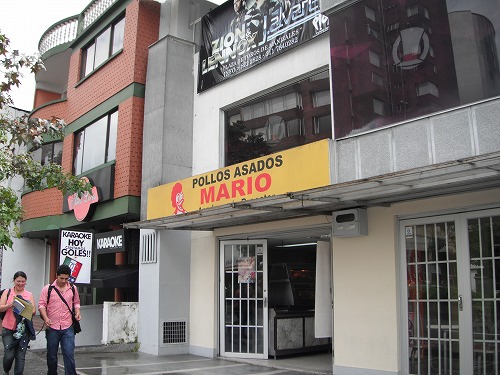 早速着替えて昼飯を食べに。メインストリートまでもにかが着いてきてくれました。有名な(?) エル・カブレ塔(Torre del Cable)が見えます。リフトのオブジェも見えます。昼飯はPollo Marioでバンデハ・チチャロンを(7,500ペソ)。ちょっと高いですが美味かったですね。ここでもアレパが付いて来ました。しかし、この間のサンタ・フェでもPollo屋(チキン屋)はマリオという名前だったな。Pollo屋をやる人はマリオが多いのかな?