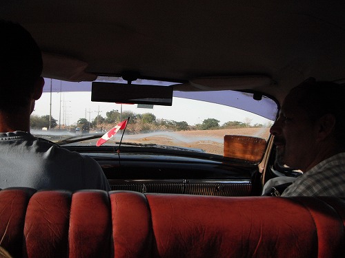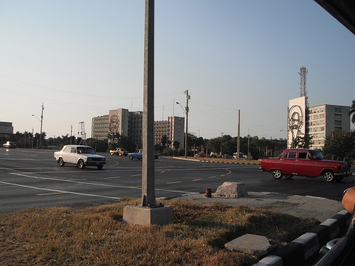 結局途中で大通りまで行くバスが来たのでそれに乗り(1CUP)大通りで降りました。おじさんがいたのでバス停は何処だと聞くと、「着いて来い」と。しばらく歩いてやってきた車を止めて「こいつ等はあんまりお金を持てない旅行者だから安くしてあげてくれ」と。ヒッチハイクです。車はかなりボロいですがアメリカのクラシックカーです。1人1CUCでCapitolioまで行ってもらえることに。ありがとうおじさん!おじさんも乗り込みます。彼はワクチンの研究をしている科学者だそうですからエリートなんですね。学会でドイツにも行ったことがあると。t途中で革命広場前を通ったのでチェとカミロを激写!