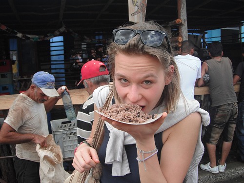 TomとTokoちゃんは自前のインスタントラーメンを昼飯にするとのことなので、ローラとワシはカーニバルへ!宿のお母さんに「露店の食べ物は何日も前から用意されたものもあるから食べないほうが良いわよ」といわれていたのにも係らず豚の丸焼きを見た瞬間そんな忠告も忘れてしまいました。なんたって謝肉祭ですからね!ローラも「食べないほうが良いんじゃないの?」って言いましたが丸焼き肉が入ったサンドイッチ10CUP購入。脂っこいですが美味いです。これが後で大変なことになるとは・・・。