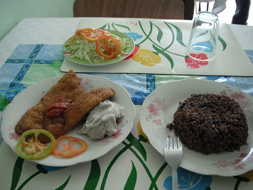 夜は宿のレストランで夕食。宿の情報ノートにも「ここの料理は絶品!」と多数書かれているのでちょっと奮発してみました(ドリンク付きで7CUC)。ボリュームもあるし美味しかったです、が絶賛するほどでは・・・。レストランは何組かのお客が入ってますしそこそこ人気なのでしょう。