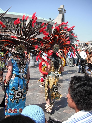 メトロを乗り継いで最寄りの駅までかなり帰って行く人がいますね。もう祭りは終わってしまったか!と思いきや寺院は人集り。ドンどこドンどこと上の方から聞こえてきます。アステカダンスですね。グアダルーペ信仰はカトリックと現地信仰を融合したらしいので、アステカダンスで祝ってるんですかね。