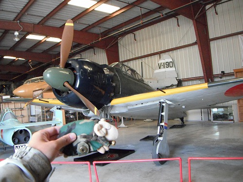 てなことで、1人でPOFにいきました。こちらの方が展示も多いですし、飛行可能なんです。アメリカの戦闘機を見て回ったら、いよいよ本命我が国の戦闘機たちにご対面です。 ハンガーに入ると、零戦と桜花が出迎えてくれます。やっぱり飛行可能な零戦は凄みがありますね。機体の下にオイルパンがおいてあります。そうです、稼動するんです。飛ぶの見て見たいなぁ。