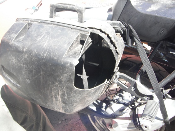 パニアはかなり破壊されていますが、ガムテープとタイラップとバンジーコードでどうにかバイクにくくりつけました。保険屋に電話して全部新品と取り替える事に。免責は100ドルなのでそれ程痛くはありませんね。