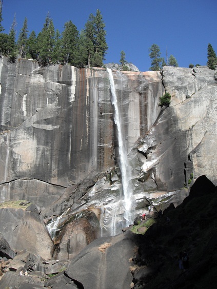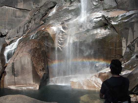 バーナルフォール(Vernal Fall) まで歩きます。ここは年中水があるのでガッカリさせません。なかなかの勢いで滝は落ちてます。轟音です!2人ともしばらくシャワーを浴びてないので滝壺に飛び込む事に!水が冷たい‼体をゴシゴシしたかったのですが、あっという間にあがってしまいました。こういうのって楽しいなぁ。タオルを持ってないので天日で乾かしてから駐車場まで戻ります。早くしないとGlacier Pointでの日暮れに間に合いません。