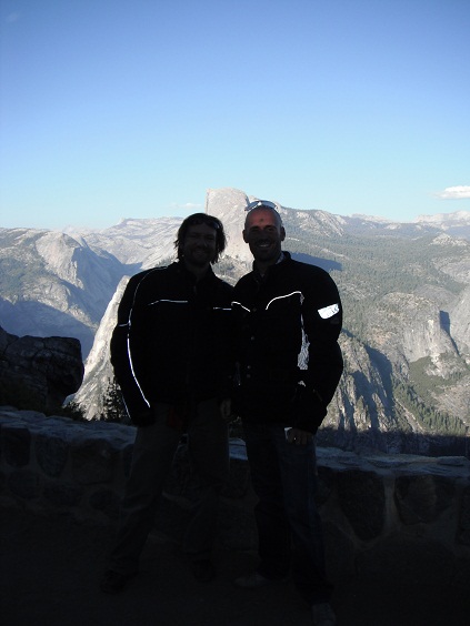 キャンプ場に戻ると駐車場に白いBMW F800GSが停まってます。ブライアンのだ!何て偶然なのでしょう。自分のサイトに戻りブライアンを探そうとしたら、「サブロー!」と呼び声が。ブライアンです。歩いていたらワシのバイクが駐車場に入るのを見たそうです。しばらくぶりの再会を祝い、一緒にGlacier Pointまで行く事に。