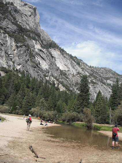 ヨセミテビレッジまでバイクで行き昼飯を食べて、スティーブンの頑張りを見てから、ミストトレイル(Mist Trail)まで行きました。 スティーブンは昨日よりかなり順調に登っているようです。望遠鏡で彼の雄姿を見させていただきました。奥さんのエリザベスさんとも話をさせていただき、感動です。