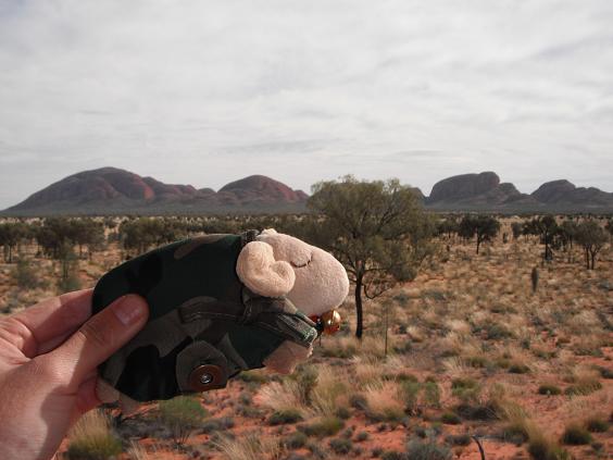 しばらく走ると、エアーズロックがチラホラ見えて来ます。オルガも見えます。3回目だからでしょうか、あんまり感動が無いです。また来たよ、エアーズロック、て感じです。