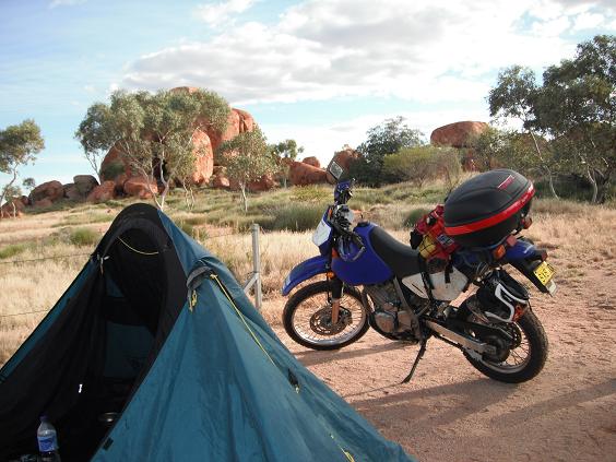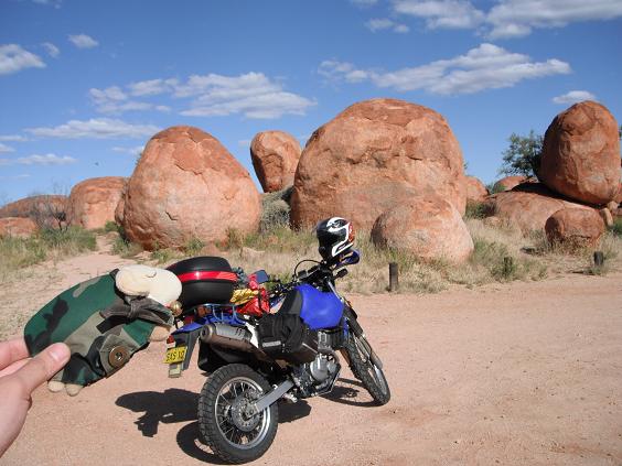 Tennant Creekから120キロ位南下するとDevils Marblesです。なかなか広い範囲に渡って丸い岩岩がゴロゴロしてます。結構いいです。今日はここで野営です。3.30ドル払います。またシャワーが無いです。パンツの記録は更新されます。Tシャツも4日着てます。シャワーが無いのはいいんですが、水が無いです。これは困った。食器を洗う分の水が無いです。どうするべかなぁ。