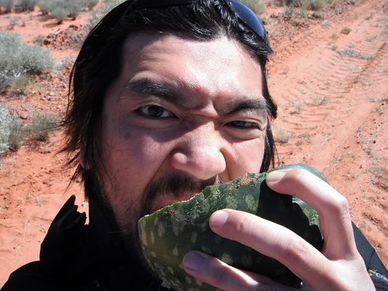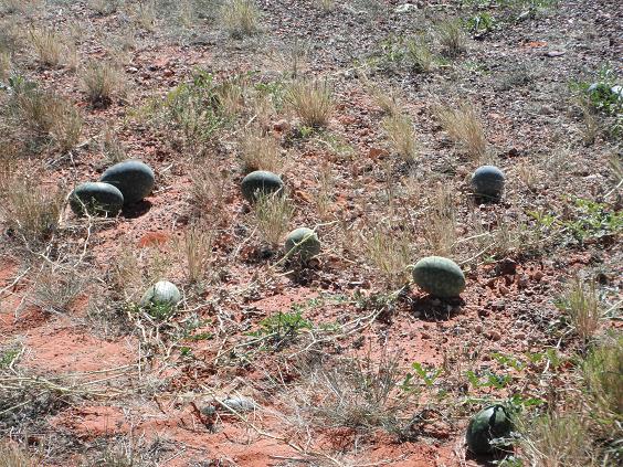 Kings Canyonまでおよそ40キロ。何故だか、スイカみたいなのが道の脇に沢山成ってます。丸いのや楕円形のです。小振りなスイカって感じです。こりゃあ是非食わないと、てことでバイクを停めて一個ゲット!