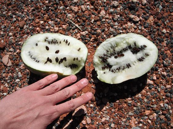 道に叩きつけて割りました。中身は白。種もスイカみたいです。ガブリと一口!味はほとんどしません。スイカの白い部分に軽く酸味が加わった感じです。スイカよりはみずみずしくありません。多分昔はアボリジニにとって貴重な水分だったに違いありません。