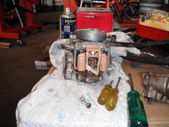 さあて、問題の孫市くんです。まずは、エンジンを吹かして問題を確認。タンクからのガソリンの流れを確認。エアクリーナーを外してキャブレターも外しました。キャブを開けようとしますが、ネジが固くドライバーでは開きません。プラヤーでガシッとネジの頭を挟んで回します。うーん、もともとキャブはいじれないんですが、自分で路肩でやろうとしなくて良かったです。キャブの中を見ると、やっぱりメインジェットがゴミで詰まってました、トホホ。エアガンでゴミを吹き飛ばし、他の部分も念のためキレイにします。