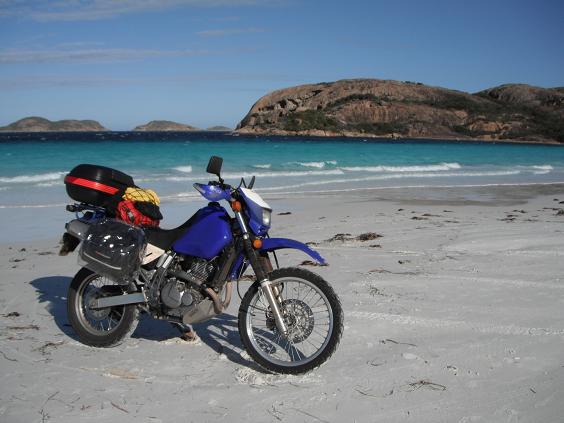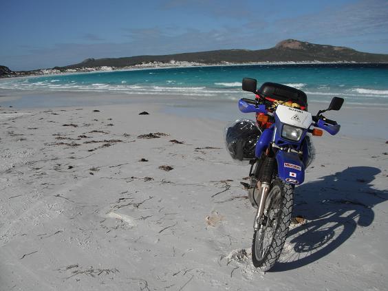 メカニックのグラハムが試乗してウイリーまでかましてました!グラハムに頼んで良かった!旅はやっぱり出会いですね。結局キャブ詰まりで、あと30キロでナラボー制覇というところで止まっちゃいましたが、また出会いが有りで、これはこれで愉しい思い出になりました。Esperanceまで200キロの道のりです。10時に出発し、12時には到着。マックでGrand Angus Bergerをたべ、これはマックとしては美味い、2日分の日記をアップ。オーストラリアで一番キレイなビーチ、Lucky Bayまで60キロ走ります。