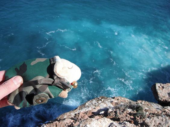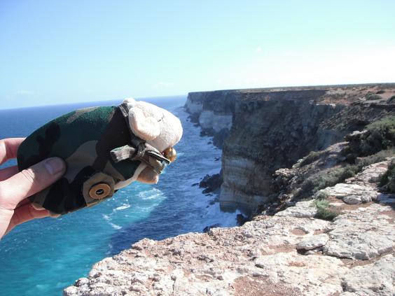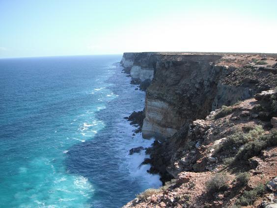 Nullarborのガソリンスタンドには何故かクジラのオブジェが。それは、ここは海から直ぐそこで、Whale watchingのポイントだからです。なんか、走ってると、海なんか全然遠い場所のような気がしますが、ね。それから100キロくらい西に走ると、左手に海が見えます。そして、今回の楽しみ、高さ100メートルのBunda Cliffsです!南極大陸とオーストラリアが分離した断崖絶壁が見事なスケールでそのまま残ってます。こりゃスゴイぜ。ヒツジさんもサンカクも記念写真。