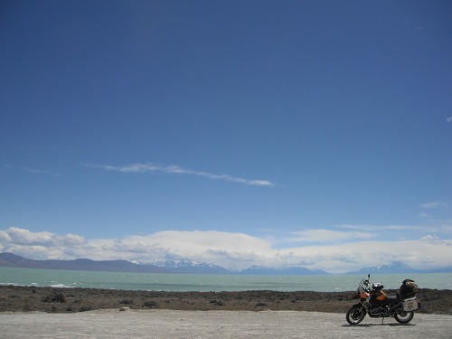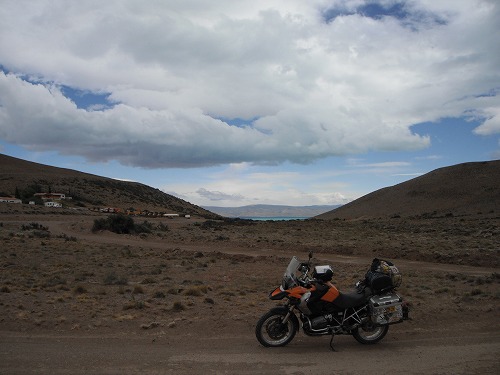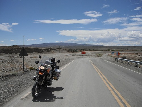 昨日買った2リットルのボトルに給油して、一路エル・カラファテへ。街を出て直ぐに29号線へ左折。未舗装路を走ります。路面状況は砂利道。所々深かったりしますが、まぁ、80キロくらいで飛ばせます。風も強いですが、まぁ、運転が怖くなるほどではないですね。右側から吹くのでバイクを右に軽く倒して走ります。途中で2リットルのガソリンを入れて、荷物を軽くします。