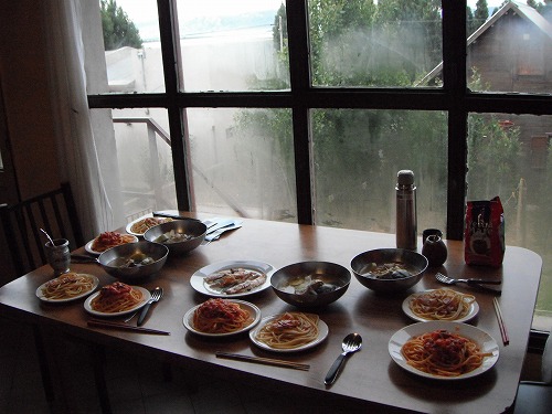オーナー夫妻からサーモンの頭をもらったので、夜はパスタとサーモンの頭でスープを作ることになり、みんなで料理。結構豪勢な夕食となりました。