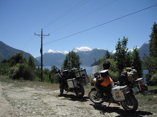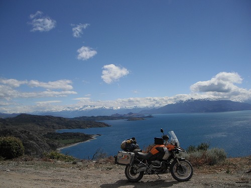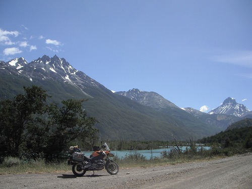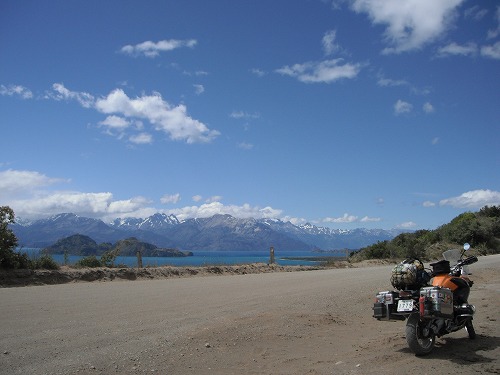 プエルト・ムルタからプエルト・トランキーロ(Puerto Tranquilo)までは40キロくらいですが、砂利が深いので走りにくい。なんでこんなに砂利を敷くのでしょうか?しかし所々で見える湖が美しい。雪を頂いた山々に、キレイな湖。絶景かな。