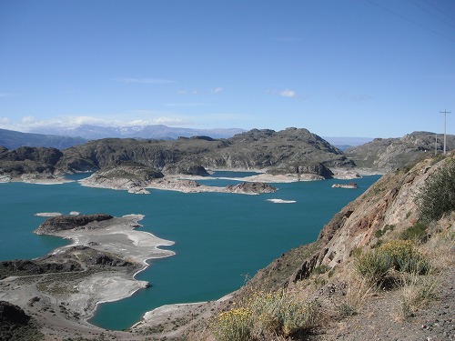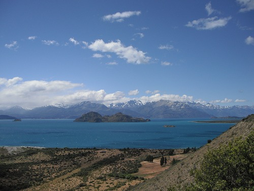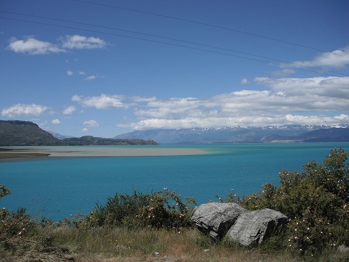 プエルト・ムルタまでくるとキレイな湖「ヘネラル・カレラ(General Carrera)」が見えてきます。エメラルドグリーンと真っ青な水を湛えた湖。いいですね。