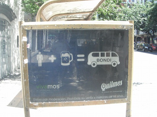 結局無駄足になり、トボトボと宿まで歩いて帰りました。途中街中で発見したビール、キルメス(Quilmes)の宣伝。人間+ビール=ボンダイ(BONDI)往き、だそうです。シドニーを代表するビーチ、ボンダイはここでも有名なのか?