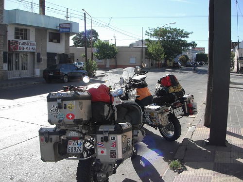 Viedmaという街で再び3号線は北進。また進行方向斜め左からの強風と闘います。100キロくらい走ったところに「YPF」があったので給油ストップをしたら、BMW R1200GS ADVに乗ったスイス人フランコが停まっていました。彼は1年半かけて世界一周をして、ブエノス・アイレスがゴール。日本にも来たそうで、日本の国旗とBMW HanedaとBMWジャパンのステッカーが張ってあります。日本にいた時には日本人に助けてもらった、とのことでジュースをおごってもらいました。ありがとう。