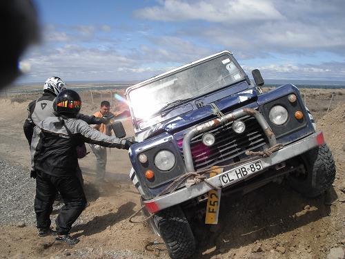 しばらくうとうとと寝てしまいました。フエゴ島がようやく見えてきて、「ここまで来たなぁ」という感慨にふけります。接岸しフエゴ島に上陸です。ポルベニールで昼飯を食べて、出発。未舗装路です。風が強し。