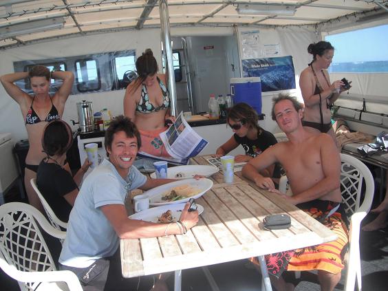 20分くらいバスにゆられて、説明とか聞いて、ビーチに到着。ここからボートでクルーザーに乗り移ります。ツアーの半数はフランス人です。舳先で海を見てたら、JeanとAlexたちと仲良くなりました。