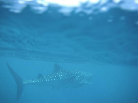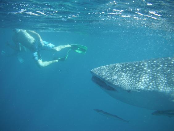 で、沖に出ていよいよジンベイと対面です。飛行機をだして探索し、ジンベイを見つけたら船に連絡する仕組みです。自然があいてなので、なかなか見つからないこともある様ですが、ワシらはすぐに見つけ船を急行させます。ジンベイの進行方向に船の後ろをもってきて、ワシらはジャボン!いきなりジンベイが目の前に現れます。こりゃすげぇ。