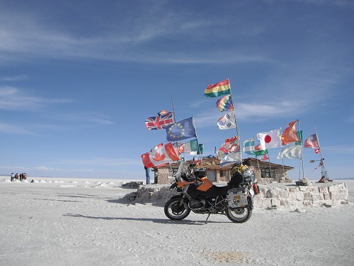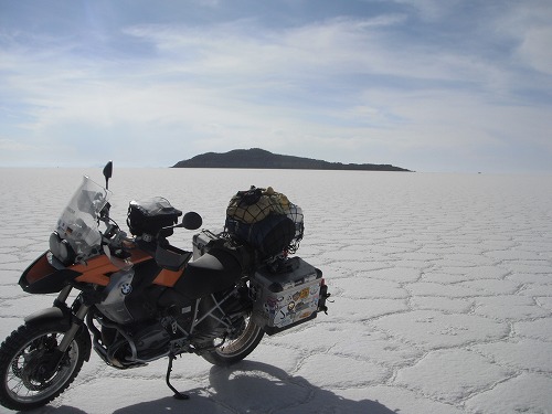 Then we came to the dry surface of the flat. We drove to the "Salt Hotel". Every where was white. It was exceptional feeling riding on the salt flat with own GS!!
