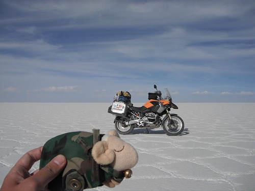 So I head back to Colchani. On the way back, I took many photos of my GS on the salt flat. Mr. Sheep was also happy to be on the flat again.