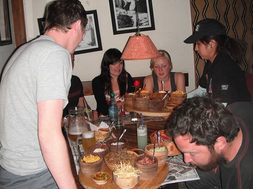 宿に戻りトムとトムの連れオージーのコーリと歓談。夜7時過ぎに夕飯へ出かけました。彼らがウユニで出会ったオージー&イギリス(パット、リサ、マット、ケリー)のグループと飯屋で合流。しかし、ここの飯屋はあまり美味そうではなかったので、一杯だけ飲んで「Joy Ride」というバー・レストランでみんなでタコス40個をシェア。メキシコ式タコスではなくてテックス・メックス式でしたが美味かったです。