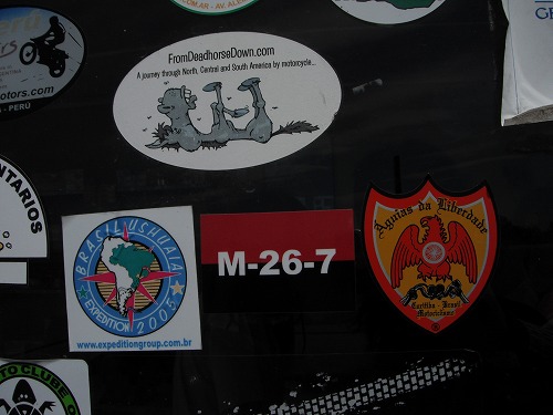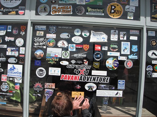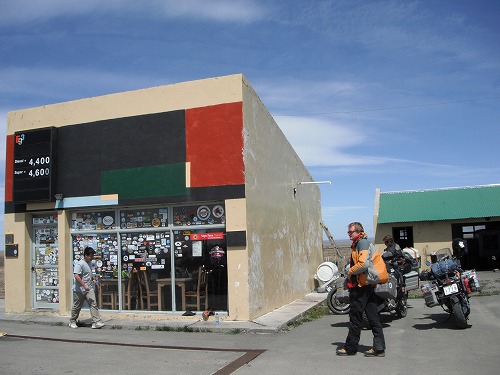 70キロ、砂利と風と戦って、タピ・アイケ(Tapi Aike)というところで舗装路に合流。給油をして、かるくお菓子を食べながら休憩。スタンドの窓にステッカーを貼り付けます。それにしても風が、強い。そして国境を目指します。